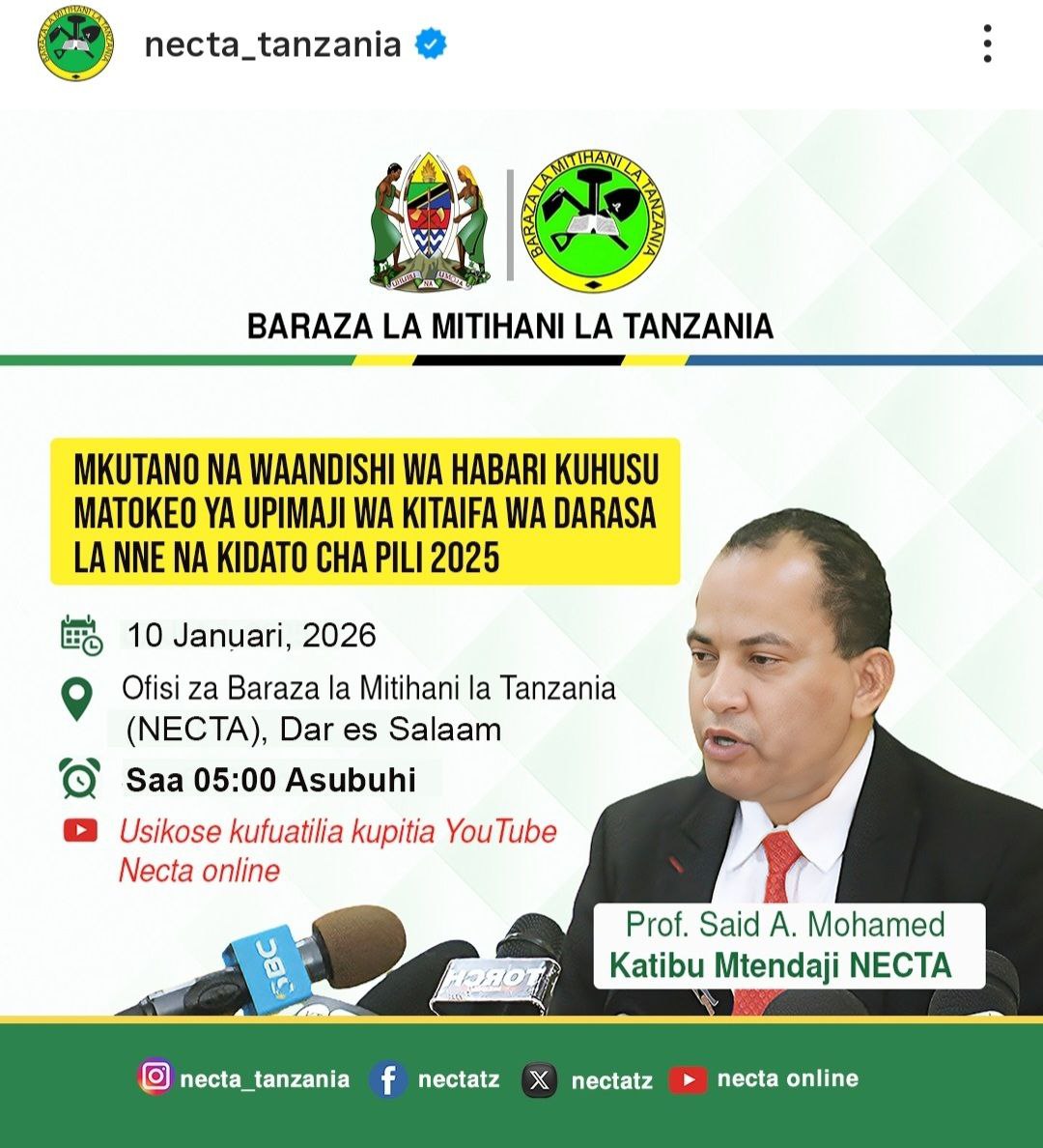 NECTA Kutangaza Leo Matokeo ya Kidato Cha Pili (FTNA 2025/26) Baraza la Mitihani la Tanzania (NECTA) linatarajia kutangaza rasmi Matokeo ya Upimaji wa Kitaifa wa Kidato Cha Pili (FTNA 2025) leo, tarehe 10 Januari 2026.